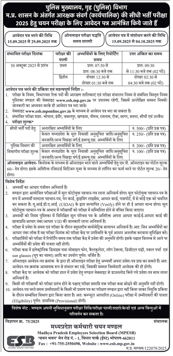 | आबकारी विभाग, मध्यप्रदेश के अन्तर्गत आबकारी आरक्षक पदो की सीधी एवं बैकलॉग भर्ती परीक्षा-2024 Exam Date Postponed Notice | Click Here |
