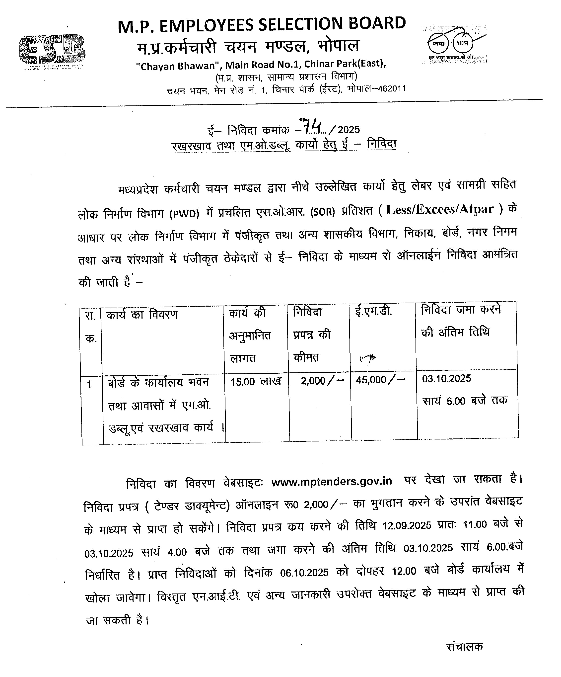 | ई -निविदा - बोर्ड के कार्यालय भवन एवं आवासों के रखरखाव कार्यो हेतु No. 74/2025 | Click Here |