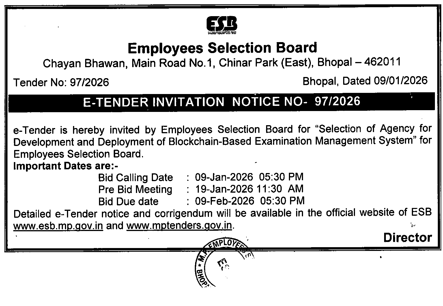 | E-tender is hereby invited by Employees Selection Board for "Empanelment of Agency to provide Question Bank No. 31/2022 | Click Here |
